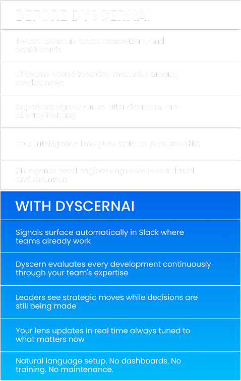 DyscernAI encodes your team's judgment and continuously applies that against every competitive move, launch, and industry shift. Decision-ready intelligence, delivered right where you work in Slack or Teams.